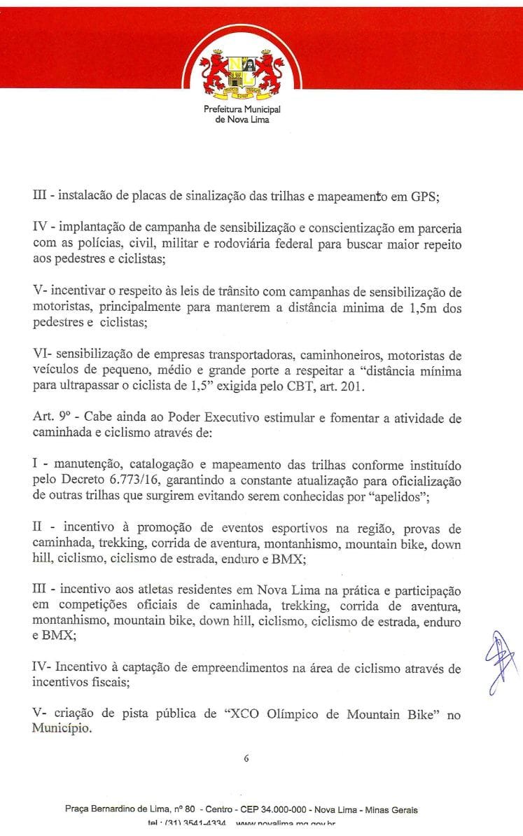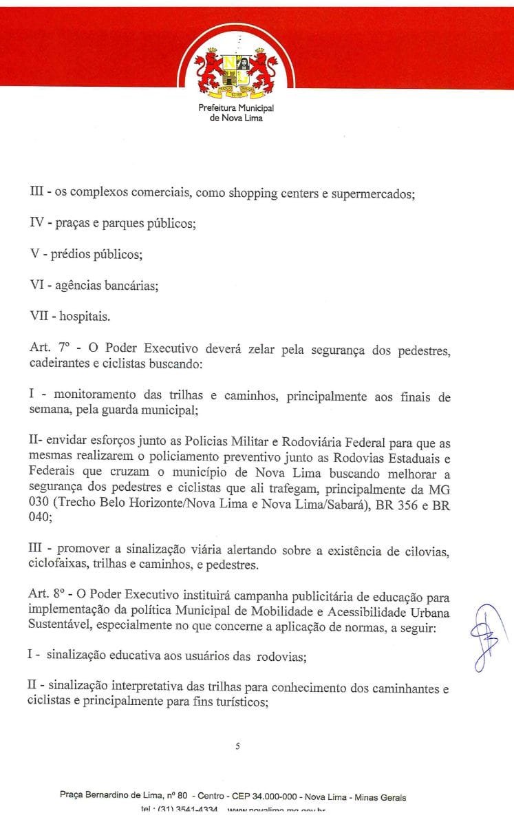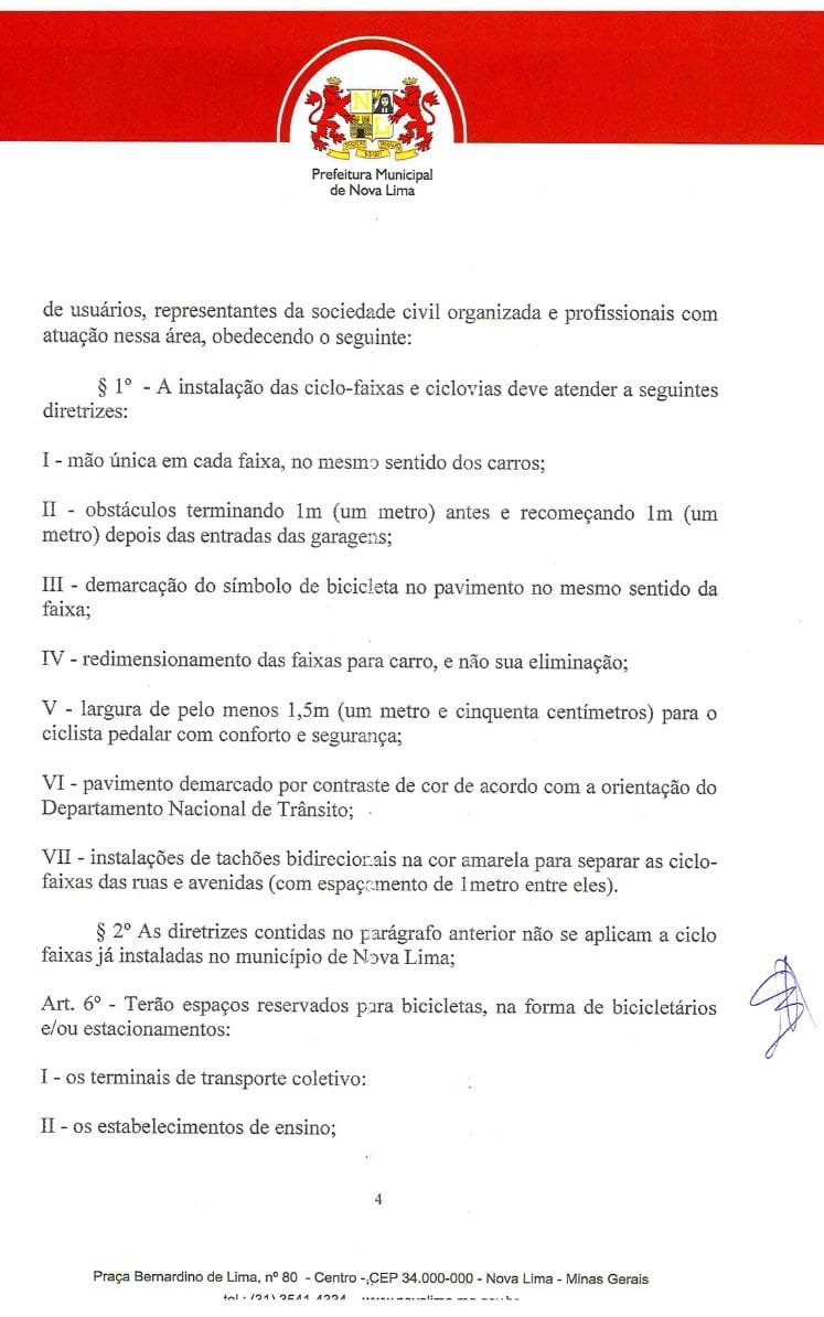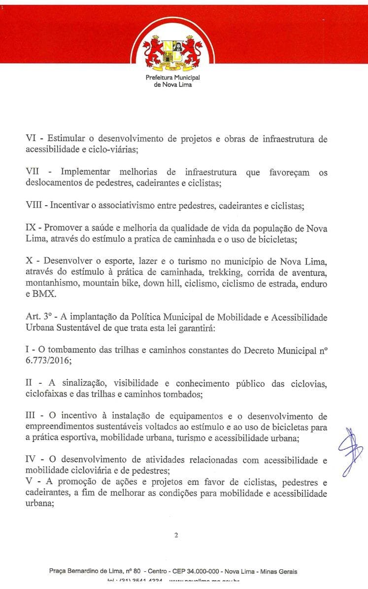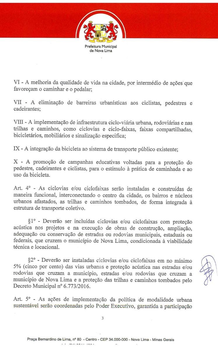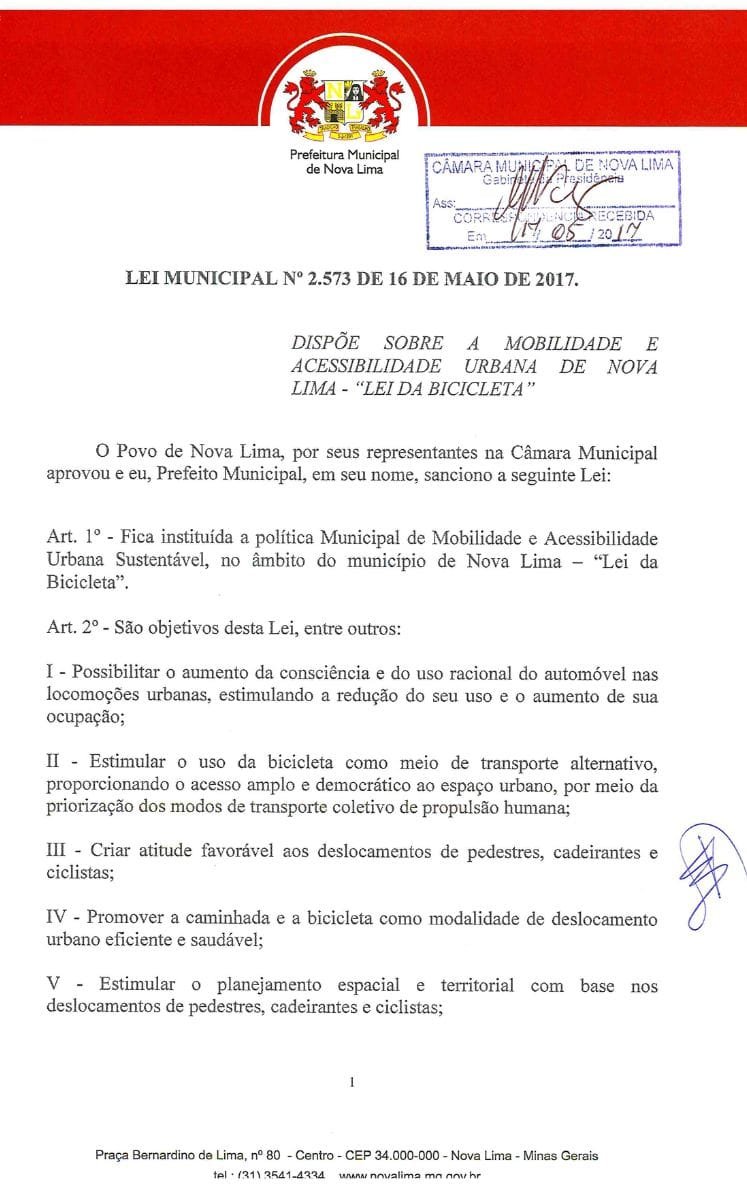 Lei Ordinária nº 2.573/2019 — “Lei da Bicicleta de Nova Lima”, que estabelece diretrizes de mobilidade, segurança e acessibilidade, fortalecendo políticas públicas voltadas ao ciclismo e à convivência sustentável no trânsito.