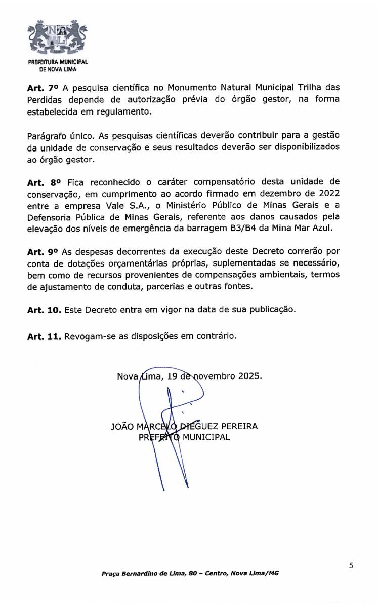 Decreto Municipal nº 5.320/2013, que cria o Monumento Natural (MONA) Serra da Calçada, abrangendo áreas de Nova Lima e Brumadinho, reforçando a proteção de um dos territórios naturais mais simbólicos da região.